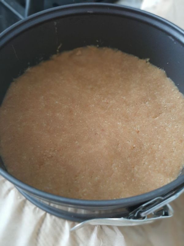 Основа начинается с печенья: 150 граммов печенья типа Юбилейное перемалывают в крошку и соединяют с 60 граммами растопленного сливочного масла. Стакан 18-сантиметровой формы плотно прессуют и отправляют охладиться на полчаса, чтобы основа застывала как надежный фундамент.