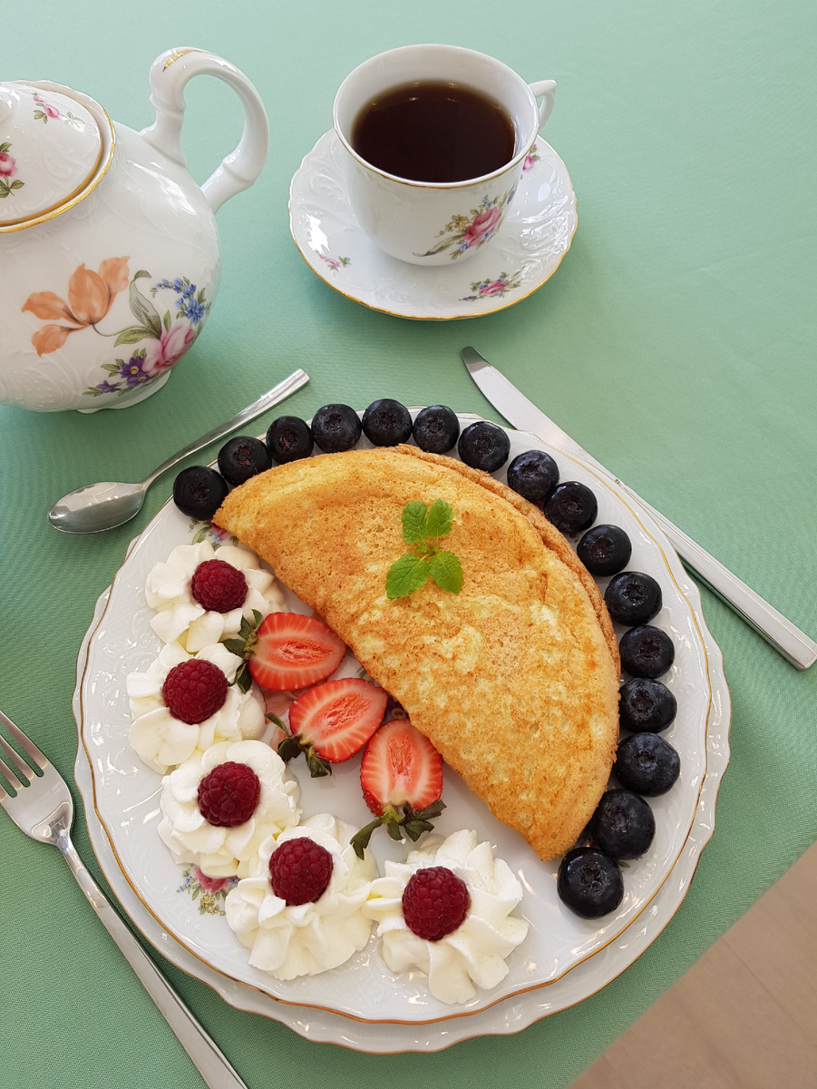 Когда омлет-суфле готов, его аккуратно складывают пополам и выкладывают на тарелку. Рекомендуется подавать блюдо со следующими дополнениями: