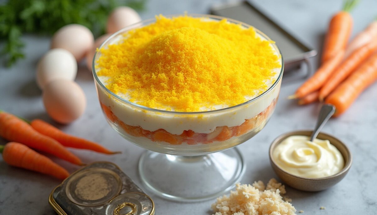 Завершив сборку, салат следует украсить желтками, создавая эффект "цветков мимозы", и отправить в холодильник на несколько часов для пропитки.