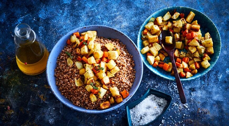 Разогрейте духовку до 180 °С.Очистите все корнеплоды и нарежьте их кубиками размером примерно 1,5 см. Выложите овощи на противень, предварительно застеленный пергаментом, полейте топленым маслом и посолите. Запекайте в течение 20-25 минут, чтобы они стали мягкими и ароматными.Тем временем в небольшой кастрюле сварите гречку: насыпьте крупу в воду (750 мл), добавьте немного соли и готовьте на небольшом огне около 30 минут до полной готовности и рассыпчатой консистенции.Когда гречка будет готова, аккуратно перемешайте её с запечёнными овощами, добавьте тимьян для аромата и подавайте к столу.Это простое, но в то же время изысканное блюдо станет настоящим украшением вашего стола. Приятного аппетита!