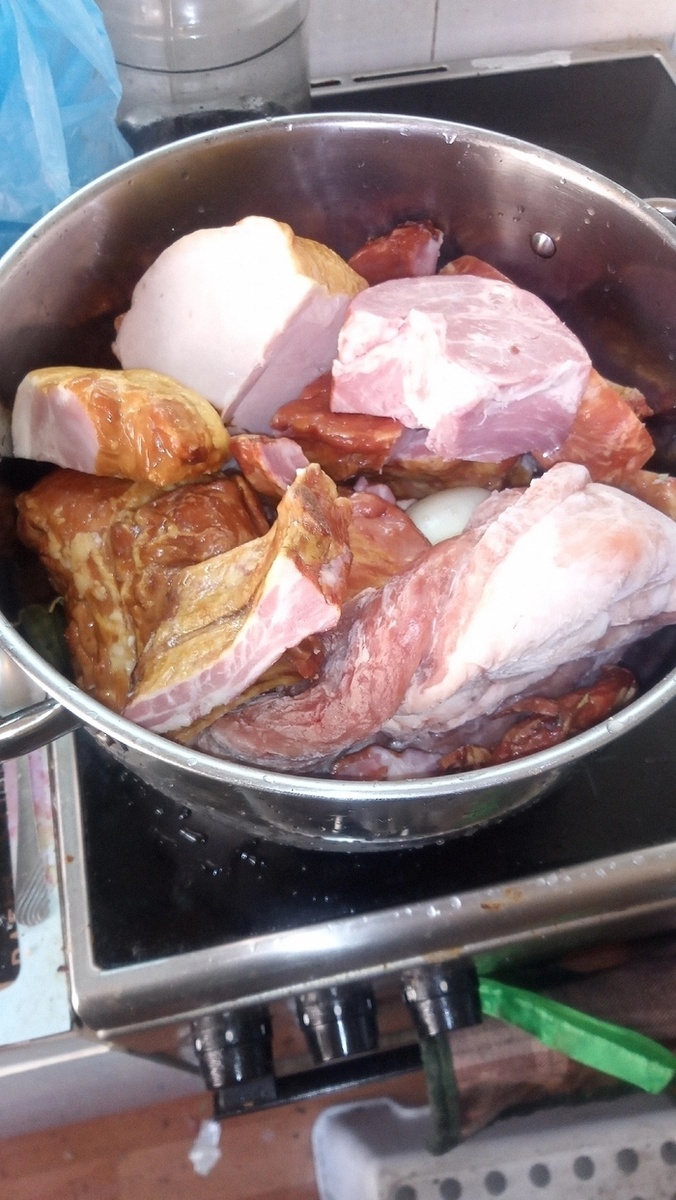 Для начала в котле нужно разместить все мясные ингредиенты, кроме колбасы и ребрышек. Закинуть одну очищенную луковицу, залить водой и варить на среднем огне около двух часов. После закипания огонь снизить до минимального. В процессе варки необходимо убирать пену. По истечении времени удалить луковицу.