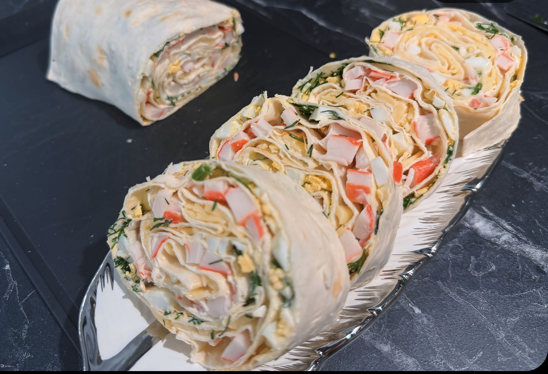 - Когда рулет остынет, нарежьте его порционными кусочками. Готовый рулет из лаваша с крабовыми палочками подавайте к столу!