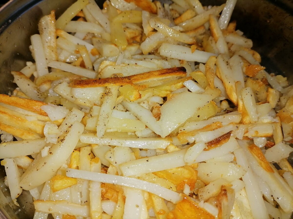 Для достижения идеального результата также важно нарезать картошку равномерно, чтобы кусочки жарились одновременно. Перемешивайте картошку не чаще 2-3 раз за все время готовки, иначе она рискует превратиться в пюре.