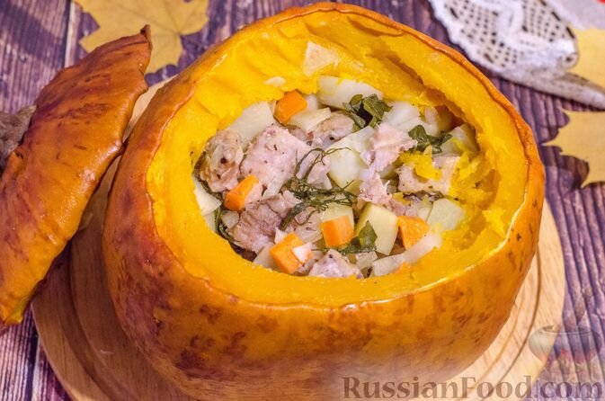 Любители оригинальности могут порадовать себя мясом с картофелем, запечённым в тыкве — такой подход к подаче не оставит равнодушным никого, а мясо будет нежным и сочным, сохраняя аромат начинки.