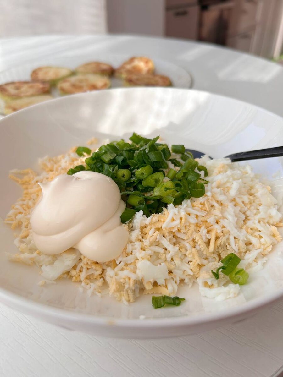 Кабачок можно обжарить в муке, чтобы он стал золотистым, или запечь в духовке. После этого аккуратно покройте кабачок яично-зеленой начинкой, и ваше блюдо готово!