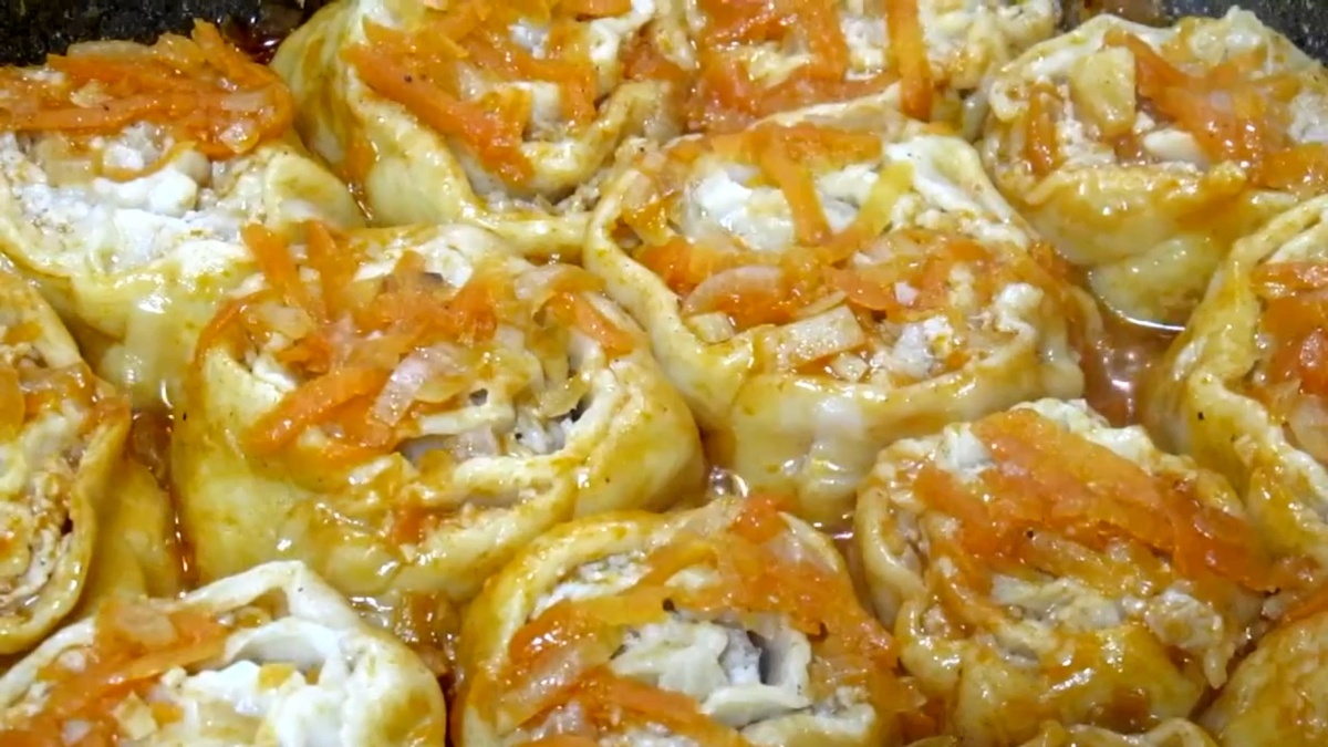 Раскатайте тесто в прямоугольник, выложите фарш и сверните в рулет. Нарежьте его на кусочки по 5 см, придавая им форму розочек. Поместите пельмени в соус и готовьте под крышкой на среднем огне около 25 минут, поливая их соусом. При необходимости можно добавить немного воды.