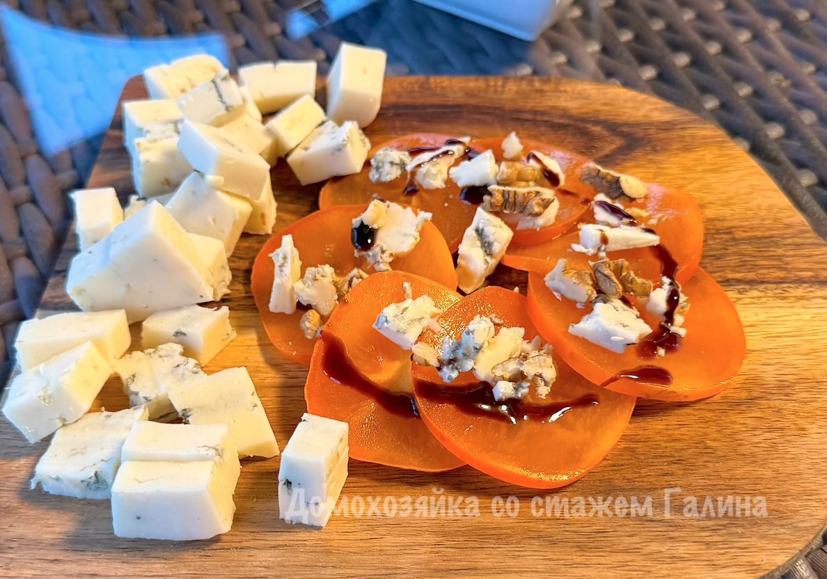 Что касается сыра, то идеальными вариантами являются сыры с голубой плесенью, такие как горгонзола, или сыры с белой плесенью. Они отлично подчеркивают сладость хурмы, создавая контраст между остротой и мягкостью.