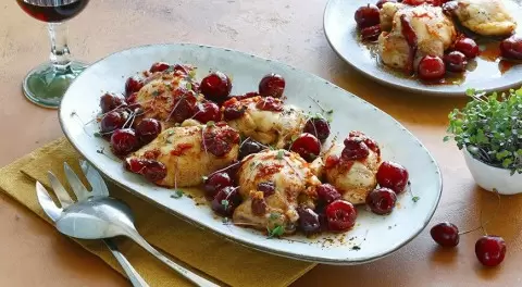 Шаг 5: Полейте запеченные бедрышки черешневым соусом и продолжайте запекать еще 5 минут. Подавайте курицу на тарелках, украсив свежей черешней и остатками соуса. Это придаст блюду изысканный вид и свежесть.