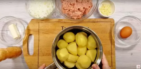 Сначала картофель нужно отварить до готовности, добавив немного соли в воду. В это время стоит заняться фаршем: на хорошо разогретой сковороде с растительным маслом обжарить мелко порезанный лук. Как только он приобретет легкую золотистость, в сковороду добавляют фарш и обжаривают в течение 5 минут, затем приправляют по вкусу.