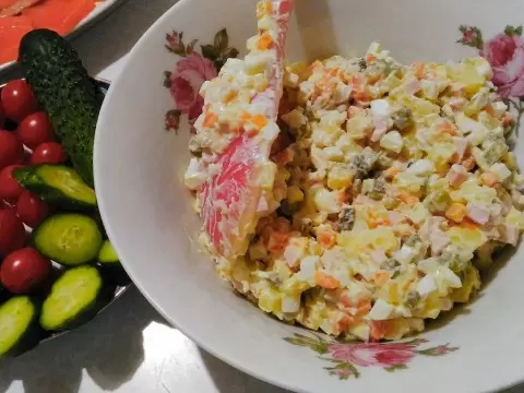 - Салат «Оливье»: Этот классический салат занимает центральное место на праздничном столе. Чтобы его приготовить, понадобятся вареная картошка, морковь, яйца, вареная колбаса, консервированный зеленый горошек и огурцы. Все ингредиенты нарезаются кубиками, смешиваются и заправляются майонезом.