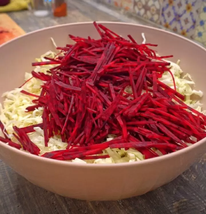 Начать следует с нарезки капусты тонкими полосками, а свеклы и моркови — соломкой. Чтобы свекла не окрасила другие овощи, её стоит немного сбрызнуть лимонным соком заранее.