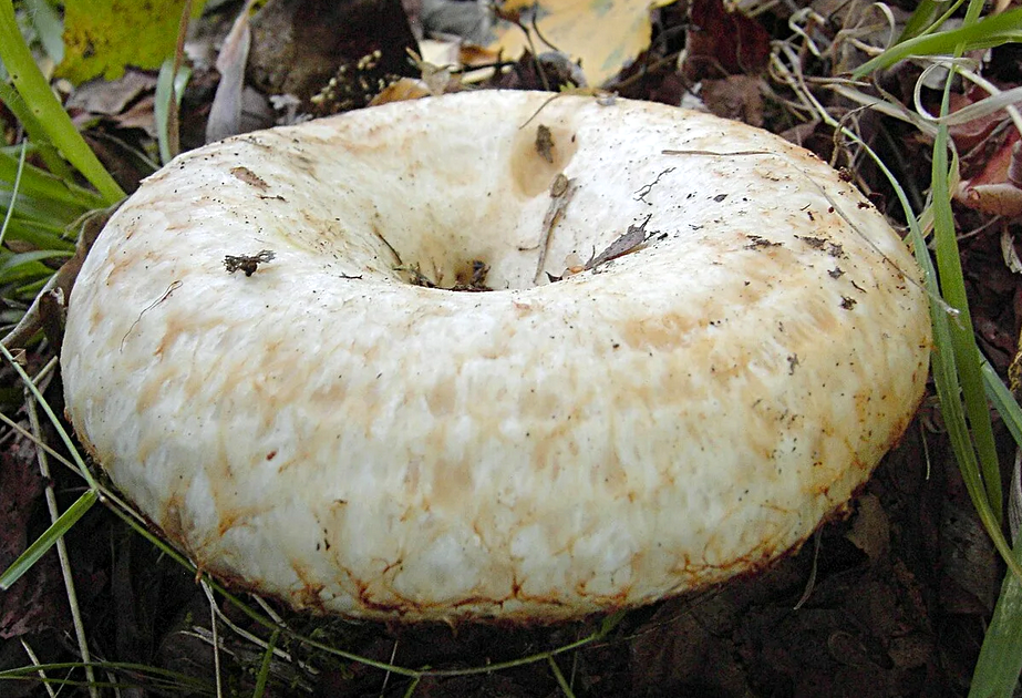 Шляпка: Самая примечательная часть груздя. У юных грибов она имеет выпуклую форму с закругленными краями, а по мере созревания становится плоской. Диаметр шляпки варьируется от 5 до 20 см, а иногда и больше. Цвет шляпки колеблется от молочно-белого до кремового с охристыми оттенками. Её поверхность обычно бархатистая, сухая, без слизистости, иногда с мелкими чешуйками. Характерные концентрические полосы также отличают этот гриб.