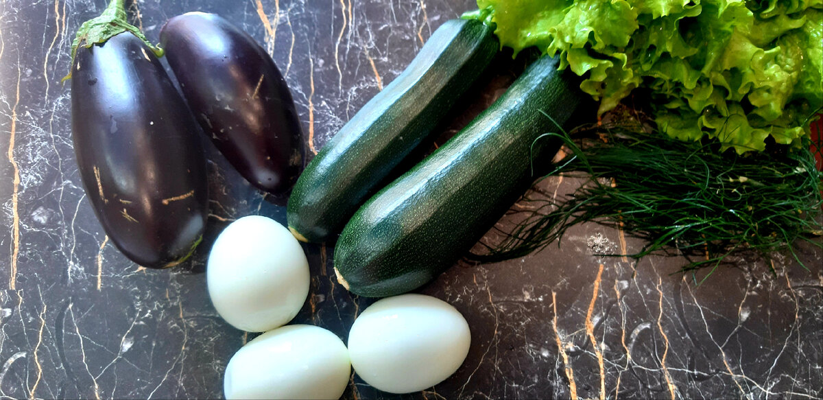 5. После жарки дайте овощам немного остыть, нарежьте яйца и соедините все ингредиенты: овощи, яйца и заранее пропущенный через пресс чеснок. Посолите, добавьте перца и тщательно перемешайте.