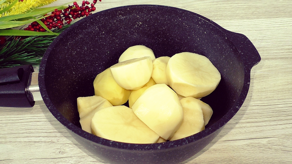Первым делом выбирается картофель. Его количество зависит от числа человек за столом, поэтому можно сварить столько, сколько потребуется. Картошку необходимо тщательно промыть и нарезать, а затем поместить в кастрюлю с холодной водой. Не забудьте добавить немного соли, это помогает улучшить вкус клубней во время варки.