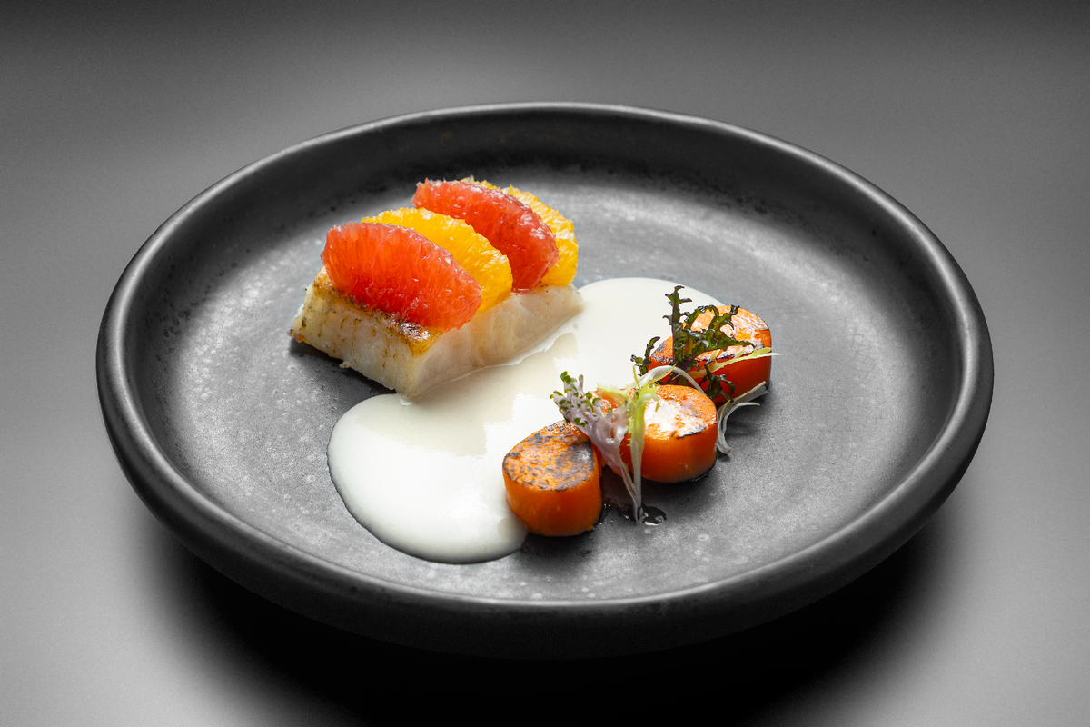 При подаче на тарелку выкладывается горячее филе палтуса, сверху поочередно располагаются сегменты грейпфрута и апельсина, а в центре стравы помещается смесь из соуса хрен и яблочного крема. Микрозелень завершает композицию на бланшированной моркови.