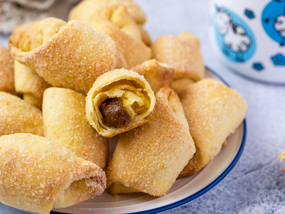После охлаждения каждую часть раскатывают в круг и нарезают на треугольники. На широкую сторону каждого треугольника выкладывается начинка из сгущенки, после чего треугольник скручивается в рогалик. Чтобы получить тот самый хрустящий слой, каждое печенье обмакивают сахаром.