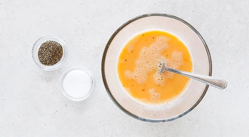 Начните с разбивания яиц в удобную миску. Легко перемешайте их вилкой, чтобы желтки и белки соединились, добавив по желанию пару столовых ложек воды. Важно не взбивать яйца до пены, но стоит посолить и поперчить массу по вкусу.