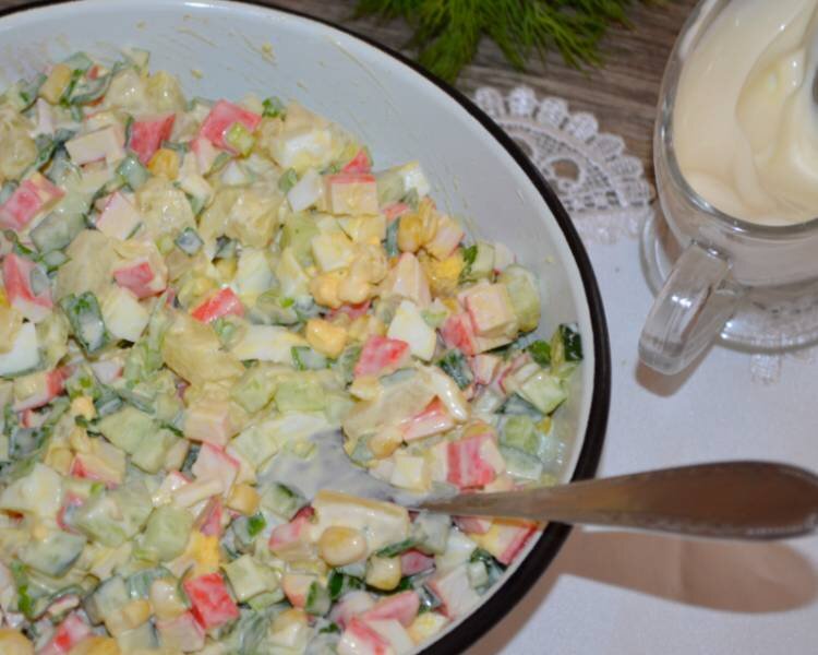 Классический салат с крабовыми палочками обычно готовят с рисом, но в этом случае мы используем отварной картофель, который придаст блюду нежность и насыщенность.