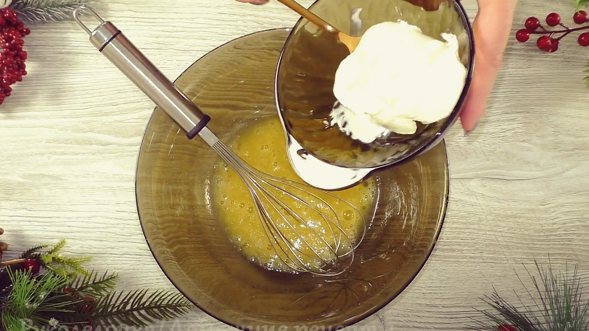 Для начала в глубокой миске смешиваются яйца, растительное масло, соль и ванильный сахар. Смесь нужно хорошенько взбить, после чего аккуратно добавить сметану и снова перемешать.
