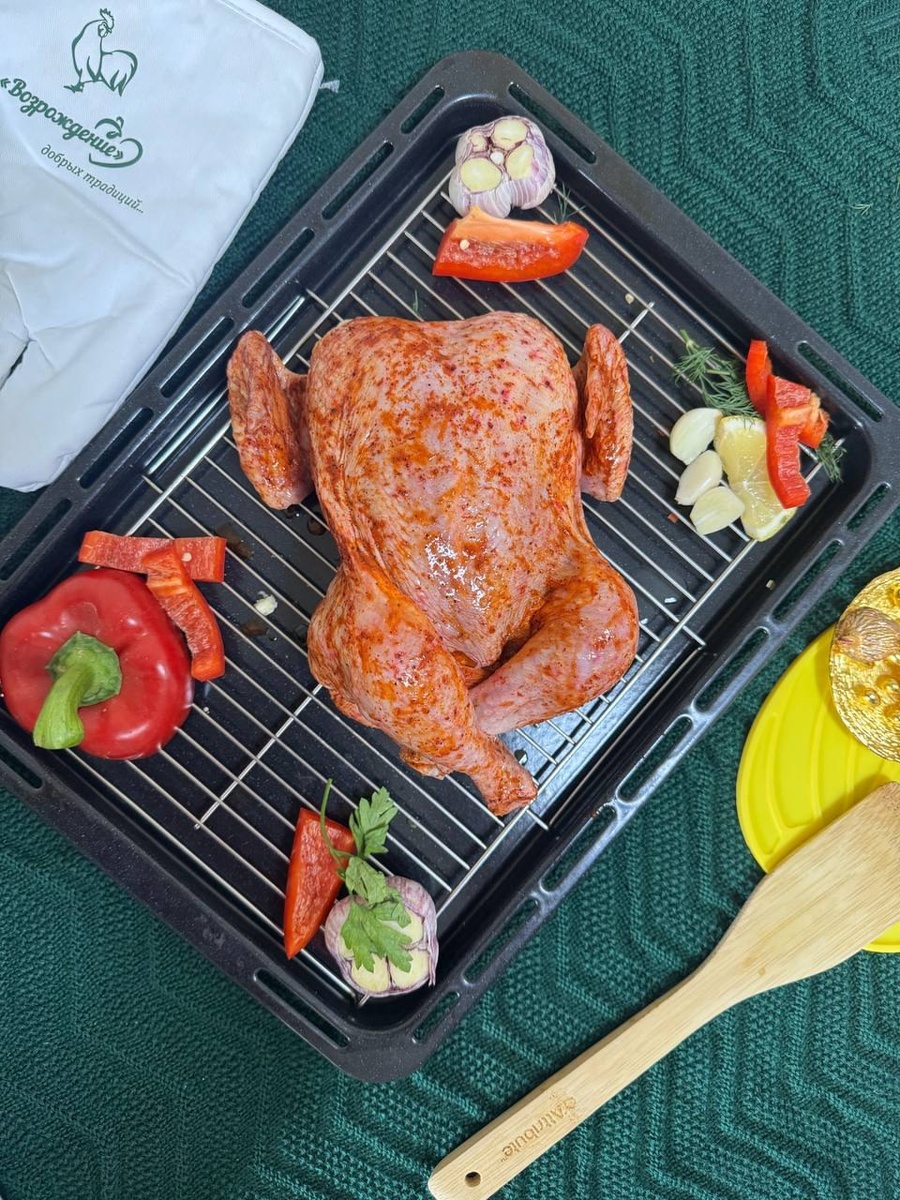 Приготовление очень простое: сначала разогрейте духовку до 180°C. Затем замаринуйте курицу на ваше усмотрение и поместите её на противень. Запекайте примерно 50-60 минут, пока она не станет золотистой и appetitной.