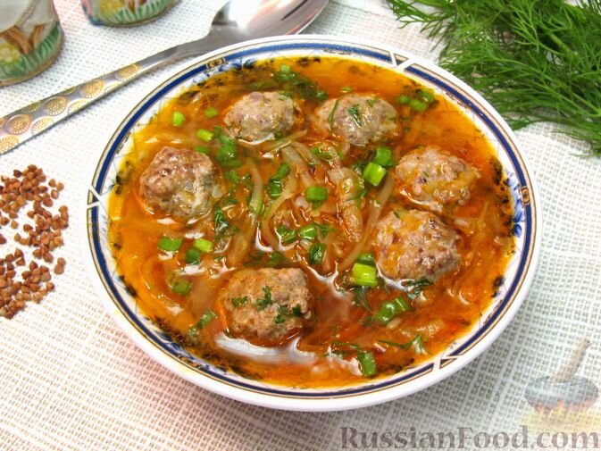 Не оставим без внимания и гречневый суп с мясными фрикадельками. Это сбалансированное блюдо, где идея сочетания гречки, мясного фарша и свежей капусты создаёт неповторимый вкус.