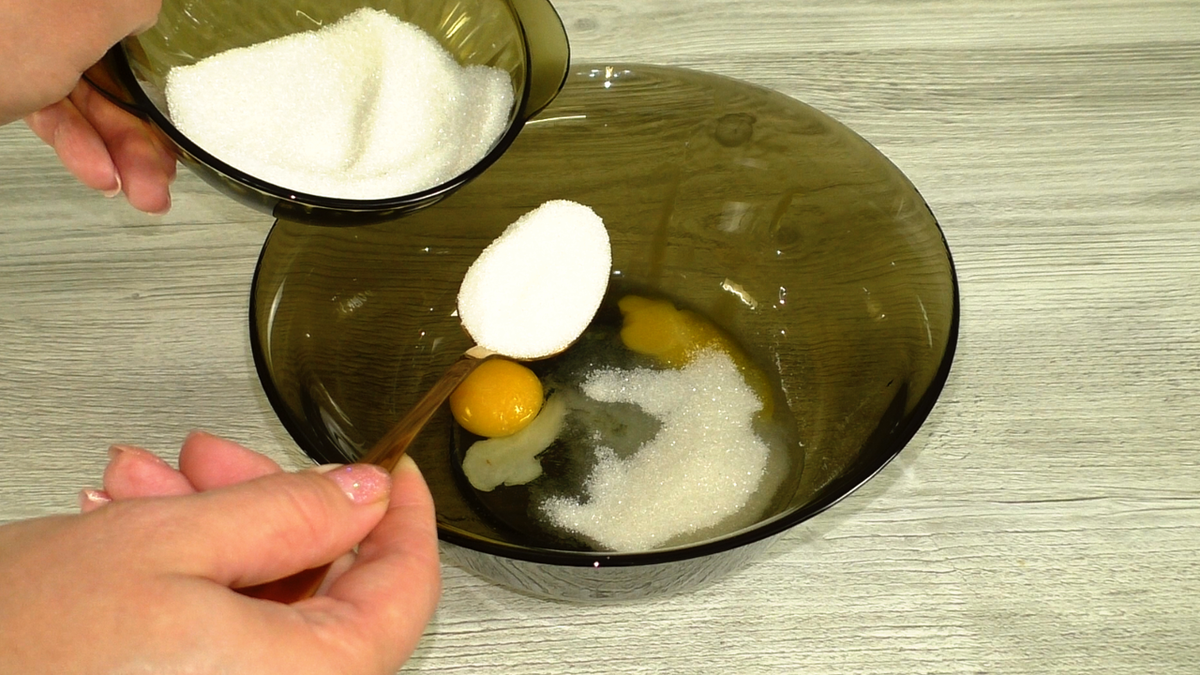 1. В глубокой миске взбить яйца с сахаром, ванилью и солью до однородности.