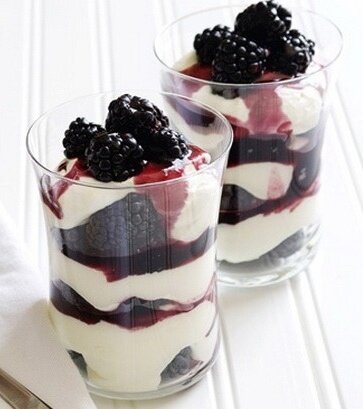 Готовую массу выложите в креманки или бокалы, украсьте оставшимися ягодами ежевики.