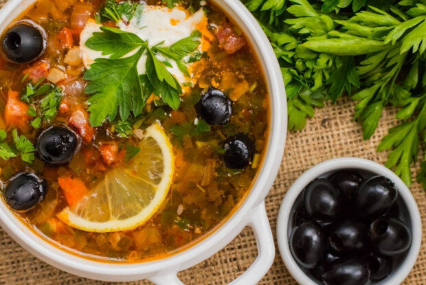 Добавить рубленую зелень и выключить огонь. Накрыть крышкой и дать настояться 5 минут. Разлить солянку по тарелкам, украсить дольками лимона и маслинами. Приятного аппетита!