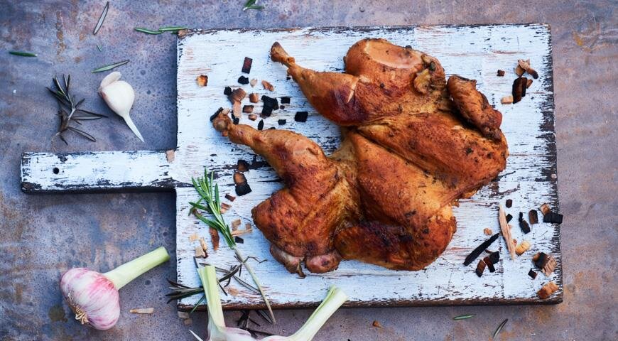 Приготовление четырех порций копченой курицы начинается с выбора качественного цыпленка весом примерно 1,5 кг.