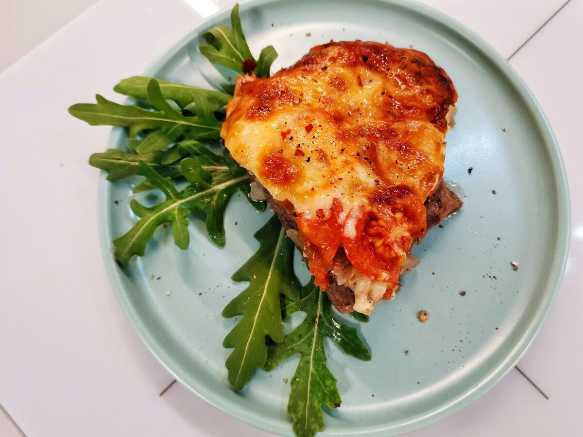 6. Нарезать помидоры тонкими слайсами и аккуратно выложить поверх мяса.