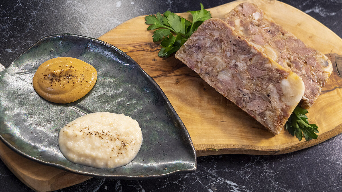 Готовый террин украшается зеленью и подается на праздничный стол с горчицей и хреном. Приятного аппетита и счастливых рождественских праздников!