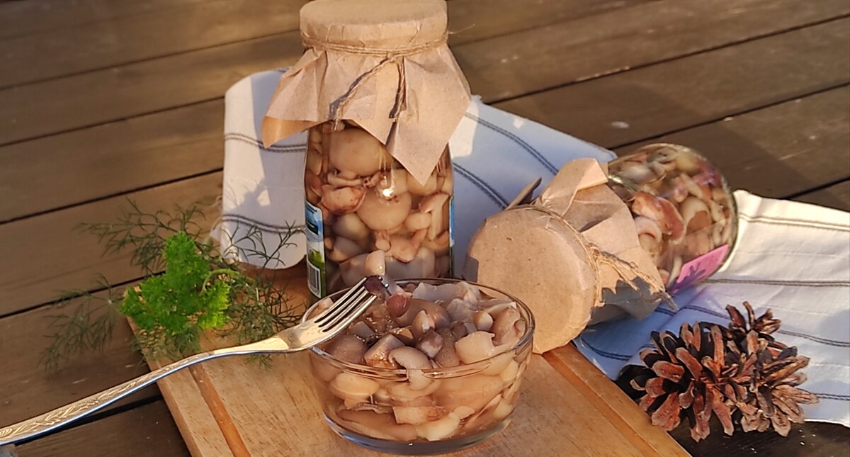 Готовые грибы разливаются по стерилизованным банкам, заливаются маринадом до края и закрываются крышками. После этого банки убираются в укрытие для остывания на 12 часов. Они могут храниться долго, даже при комнатной температуре.