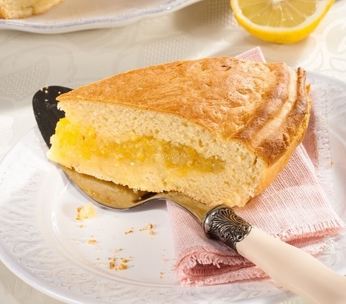 Разогреть духовой шкаф до 220°С. Раскатать обе части теста в пласты толщиной 1-1,5 см. Первую часть выложить на смоченный водой противень, сверху разместить лимонную начинку, закрыть второй частью теста и защипнуть края. Не забудьте проколоть верхнюю корку вилкой в нескольких местах для выпуска пара. Поставить в духовку на 40 минут.