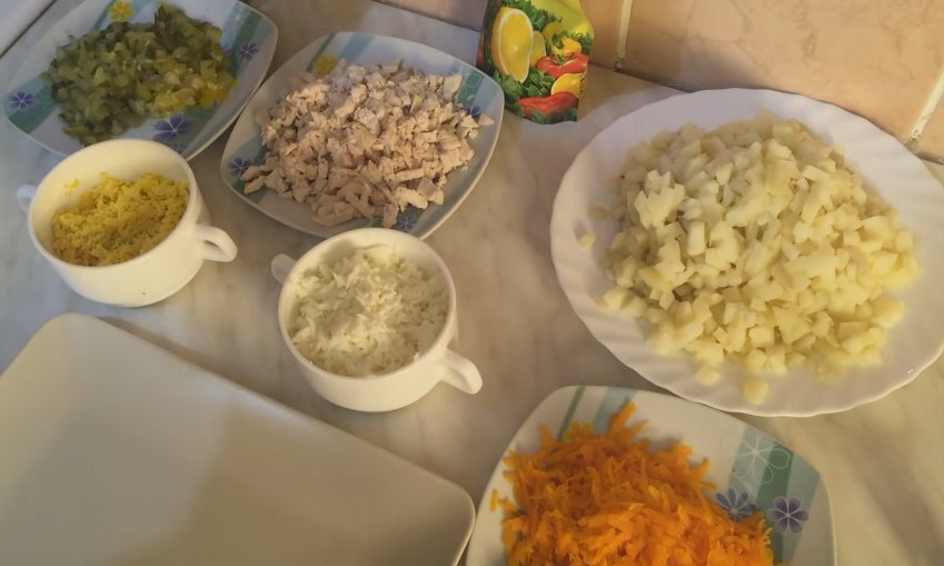 1. Подготовьте все ингредиенты: натрите вареную морковь и яйца, отделив желтки от белков. Картофель нарежьте кубиками, так же как соленый огурец и курицу.
