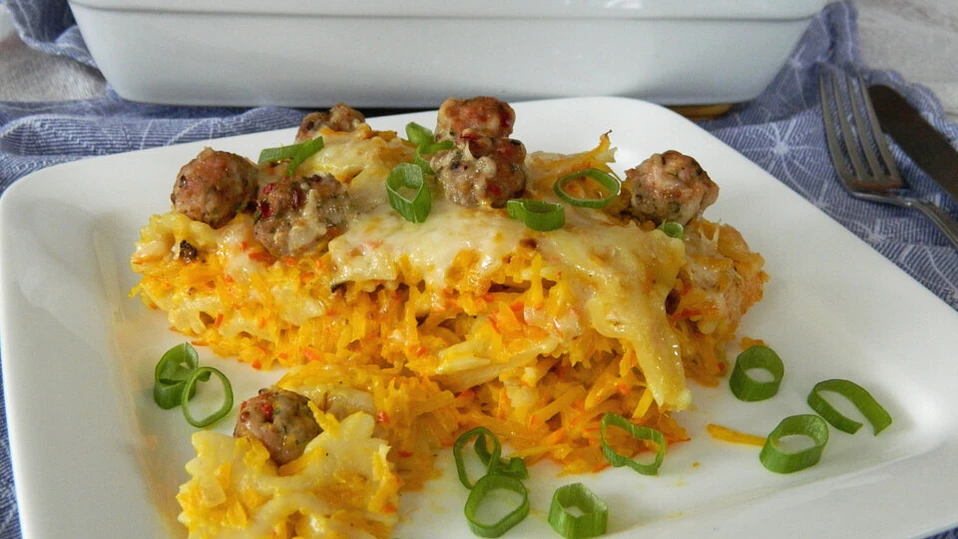 Теперь смешайте пасту с тыквенной смесью и выложите все в заранее смазанную маслом форму для запекания. На верх выложите фрикадельки и посыпьте натертым сыром.