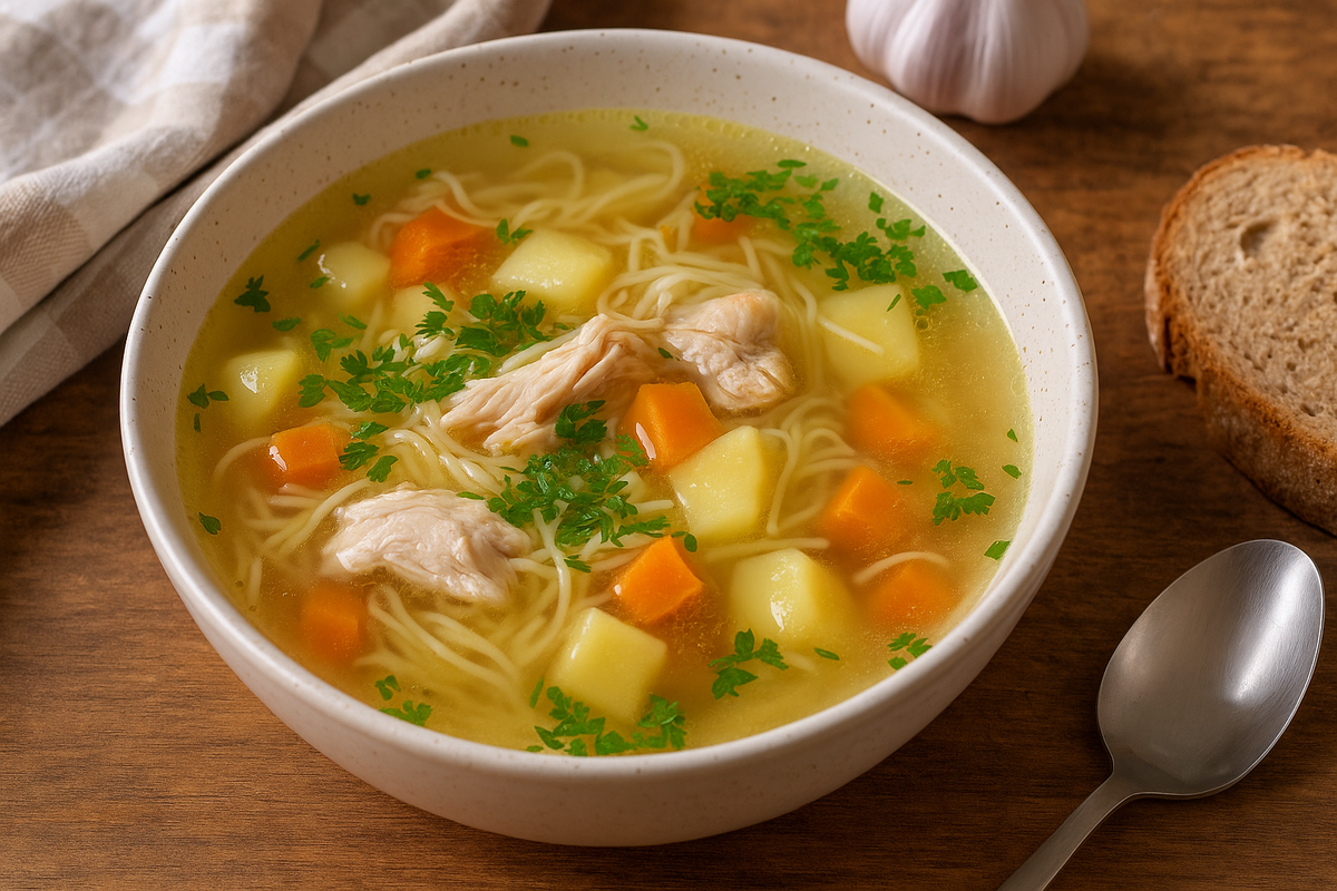 Ищете идеальный рецепт быстрого, сытного и очень уютного супа? Этот вариант станет настоящей находкой. Ароматный бульон из куриных бёдер, нежные овощи, золотистая поджарка и тонкая вермишель «паутинка» создают вкус, который согревает душу и возвращает в детство.