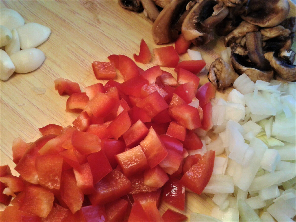 Первым делом нужно порезать овощи. Репчатый лук нарезаем небольшими кубиками, а сладкий перец можно использовать любого цвета. Чеснок следует дать хорошенько раздавить, а грибы нарезать покрупнее для большей текстуры.