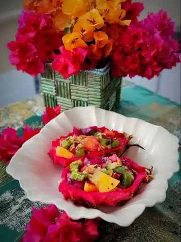 Затем все подготовленные компоненты тщательно перемешивают и наполняют ими лодочки из питахайи. Такой яркий и полезный салат сможет украсить и поднять настроение на любом празднике!