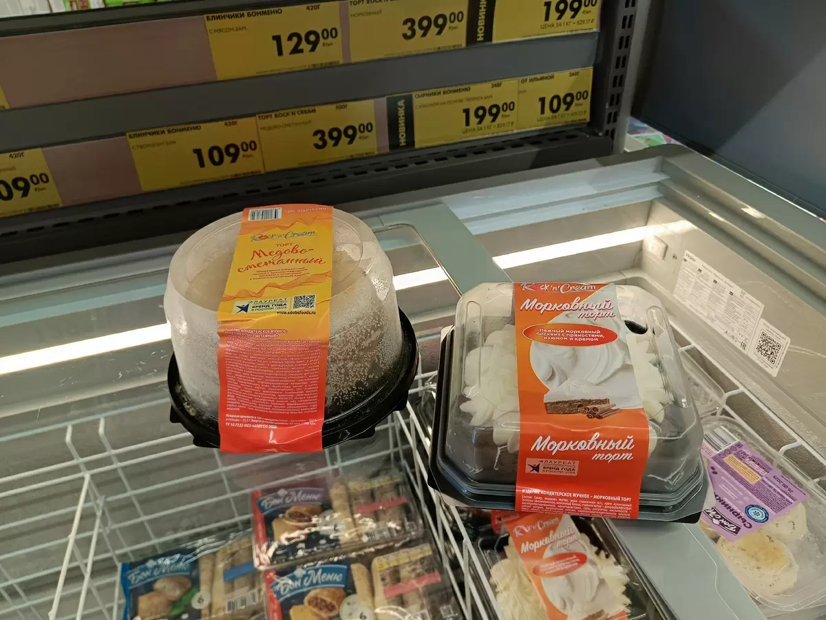 На витрине свежих сладостей выделяются два вида тортов: «Морковный» и «Медово-сливочный». Оба десерта весом 500 граммов предлагаются по цене 399 рублей. Несмотря на простоту дизайна, их вкус может удивить даже самых взыскательных гурманов.
