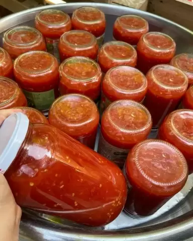 Полученную томатную массу нужно разлить по заранее подготовленным стерильным банкам. Не забудьте закрыть банки горячими крышками. Далее процесс требует специальной стерилизации: поместите банки в бак с водой и доведите до кипения.