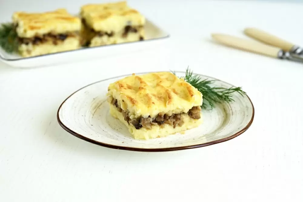 Форму для запекания заполняют слоями: первый слой — картофельное пюре, затем слой грибов с луком, и снова картофель. Чтобы запеканка приобрела аппетитную золотистую корочку, верхний слой украшает взбитым яйцом.