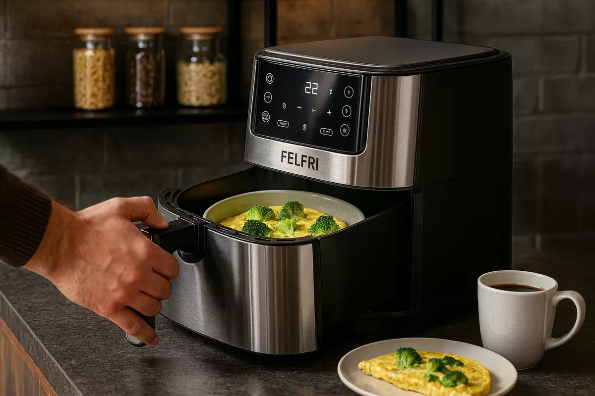 Утренние часы часто бывают напряженными, и в это время особенно важна простота. Предлагаем вам отличный способ приготовить вкусный и легкий омлет с брокколи, который займет всего 15 минут. Благодаря аэрогрилю FELFRI 5,5 л / 1800 Вт, качеству жарки и удобству приготовления, вам не придется стоять у плиты и мыть лишние посуды.