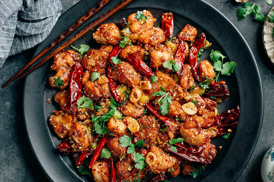 Куриные бедрышки нарезать на небольшие кусочки и положить в миску. Добавить ингредиенты для маринада и тщательно перемешать руками. Оставить на 10-15 минут для маринования.Имбирь измельчить, чеснок нарезать слайсами. Белую часть зеленого лука нашинковать.В отдельной миске смешать все ингредиенты для смеси специй.Ингредиенты для панировки положить в пакет и перемешать.Переложить курицу в пакет с панировкой, встряхнуть и аккуратно помассировать, чтобы каждый кусочек был покрыт смесью.Разогреть сковороду на среднем огне с растительным маслом. Когда масло нагреется, выложить курицу в один слой и не трогать, пока не образуется золотистая корочка. Перевернуть и обжарить до готовности со всех сторон. Уменьшить огонь и переложить курицу на тарелку.Если на сковороде осталось недостаточно масла, добавить пару столовых ложек. Обжарить сычуаньский перец, помешивая, до темно-коричневого цвета, затем убрать горошины.Добавить чеснок, имбирь и зеленый лук, обжаривать, пока не появится аромат.Добавить смесь специй и перемешивать, пока перец не станет немного темнее, но не подгорит.Вернуть курицу в сковороду и тщательно перемешать. В конце добавить листья кинзы и еще раз перемешать. Снять с огня.Приятного аппетита!