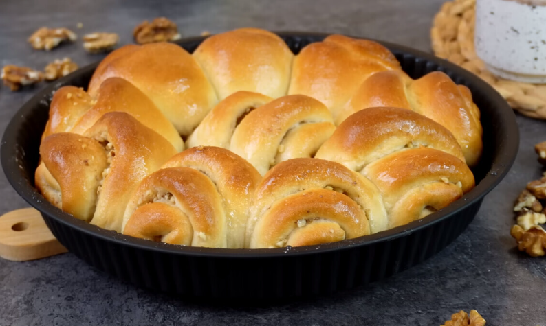 Для начинки грецкие орехи мелко измельчаются в блендере, смешиваются с сахаром — начинка готова. Когда тесто подошло, его нужно разделить на небольшие части, по 60 г каждая. Затем каждая часть раскатывается, смазывается растительным маслом, на нее кладется начинка и делается надрез. После этого формируется пирожок, который выкладывается на противень и оставляется на 10 минут, прежде чем отправить в духовку на 25 минут при температуре 180 градусов. По готовности пирожки нужно смазать сахарным сиропом, приготовленным из сахара и воды.
