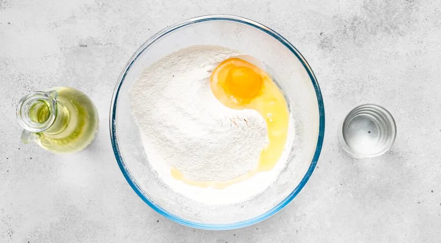 1. В широкой миске объедините просеянную муку и соль. В центре сделайте углубление, добавьте яйцо, теплую воду и растительное масло. Все тщательно перемешайте вилкой до получения липкого теста, похожего на тесто для пельменей.