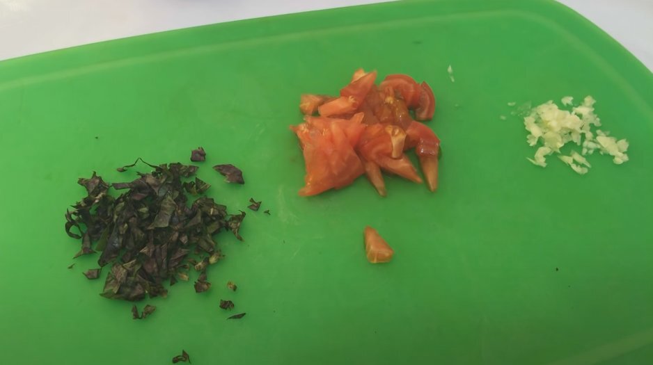 1. Подготовьте ингредиенты: мелко нарежьте чеснок и базилик, а помидор — если используете.