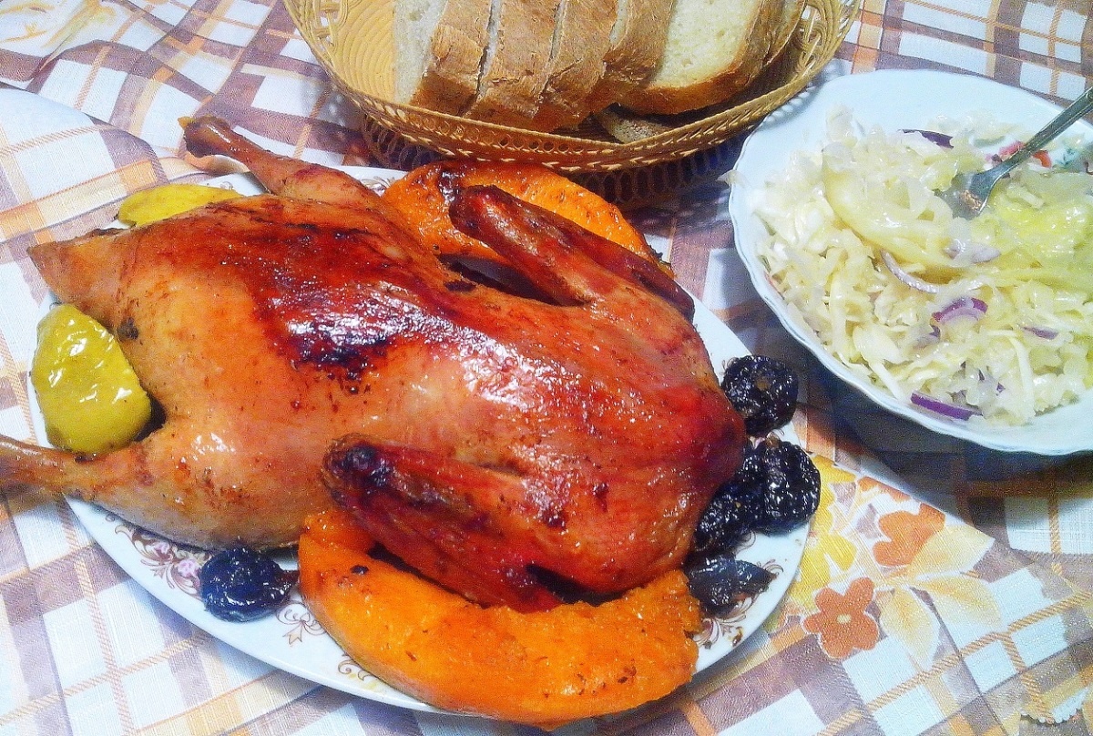Затем внутрь утки заполняют яблоки и чернослив, после чего тушка зашивается толстыми нитками для сохранения начинки. Крылья и ножки утки также фиксируются, чтобы они плотно прилегали к корпусу.