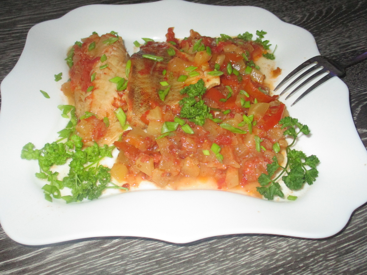 Как только овощи подрумянятся, добавляется томатная паста и все тщательно перемешивается. Спустя несколько минут в смесь вносятся нарезанные помидоры и любимые специи. Через 3-4 минуты готовки овощной основы, на сковороду выкладываются аккуратно подлитые кусочки готового морского окуня. Блюдо необходимо посолить и оставить на огне еще 2-3 минуты, а затем аккуратно перевернуть рыбу.